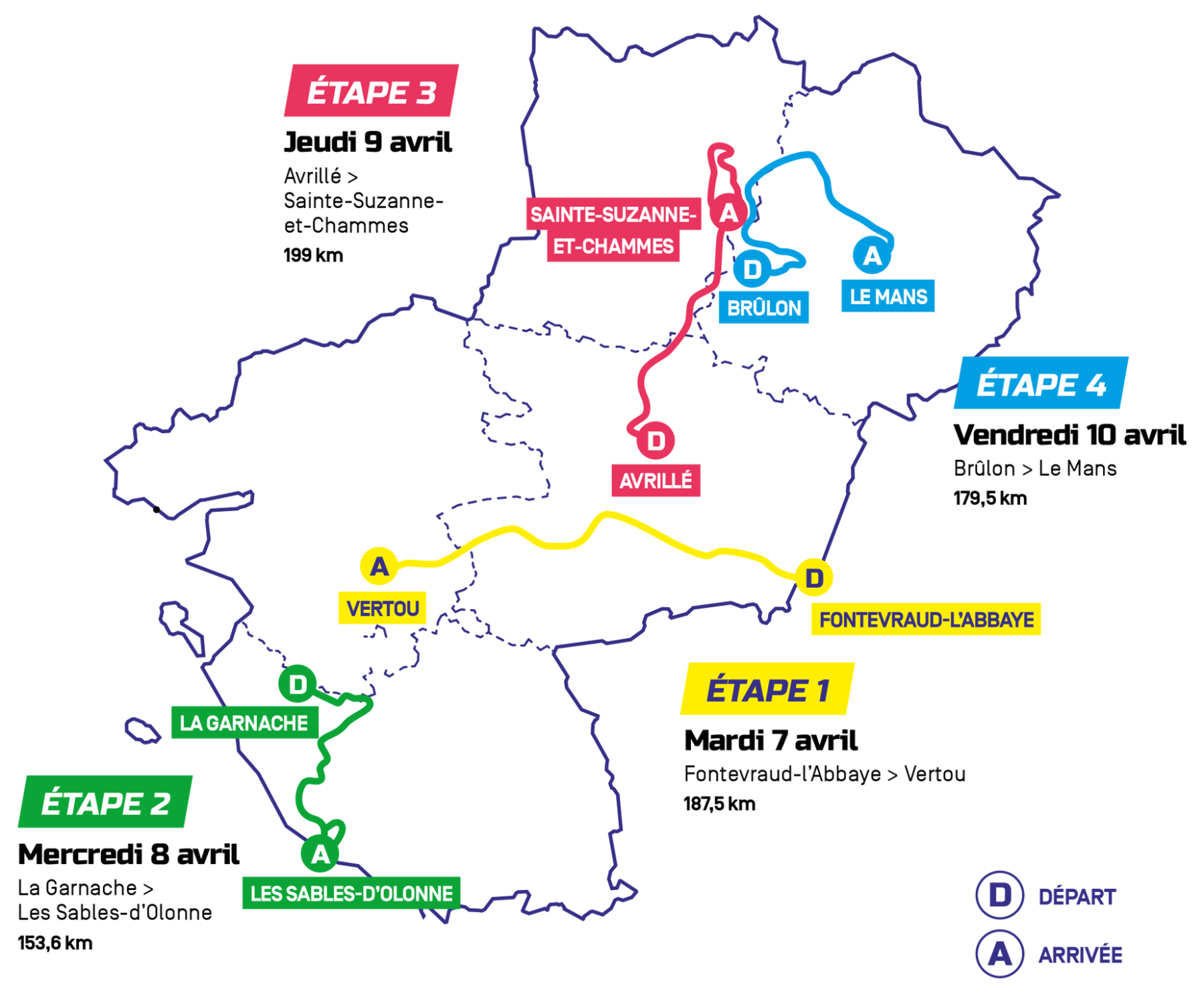 Région Pays de la Loire Tour Mardi 7 au vendredi 10 avril 2026 Course en 4 étapes – Parcours long de 720 km Diffusion TV sur la chaine L’Equipe canal 21 de la TNT